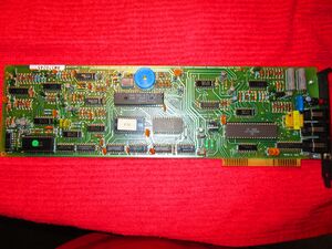 This is what appears to be a modem card designed to fit into a 8-bit ISA slot, in particular on the original Compaq Portable.
